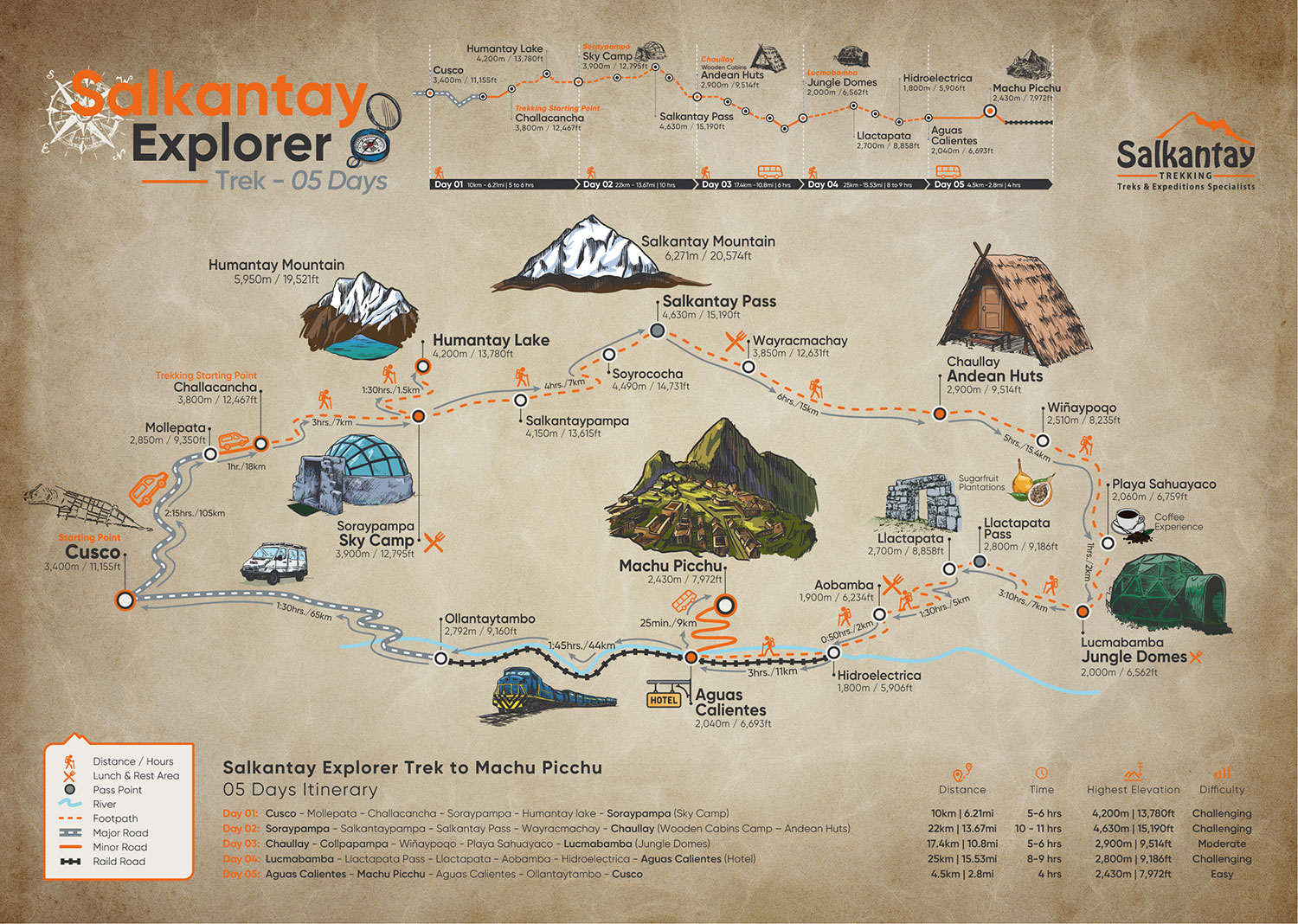 Throughout the expedition, travelers move from majestic glaciers and turquoise high-altitude lakes to the cloud forest and the high jungle of Cusco, crossing multiple ecosystems in a unique natural progression. The route includes unforgettable highlights such as Humantay Lake, the imposing Salkantay Pass (4,630 meters / 15,190 feet), a coffee experience in the cloud-forest fringe, and the first view of Machu Picchu from Llactapata before culminating in a guided exploration of the legendary Inca citadel.