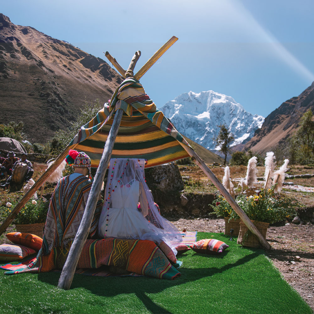 Ready and waiting for you back at camp is your Andean wedding ceremony, which will be set up while you’re away. It’ll take place in the middle of the natural environment, with Salkantay Mountain towering above you. An Andean priest is in charge of the ceremony, and he’ll conduct the service according to Andean traditions and rituals.